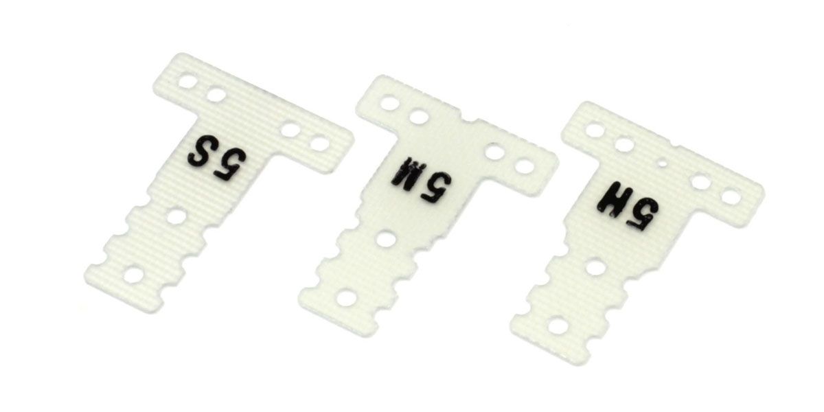 0.5mm-thick FRP rear suspension plate set. Contains soft, medium and hard plates. Softer than the MZW409, which is 0.6mm thick.