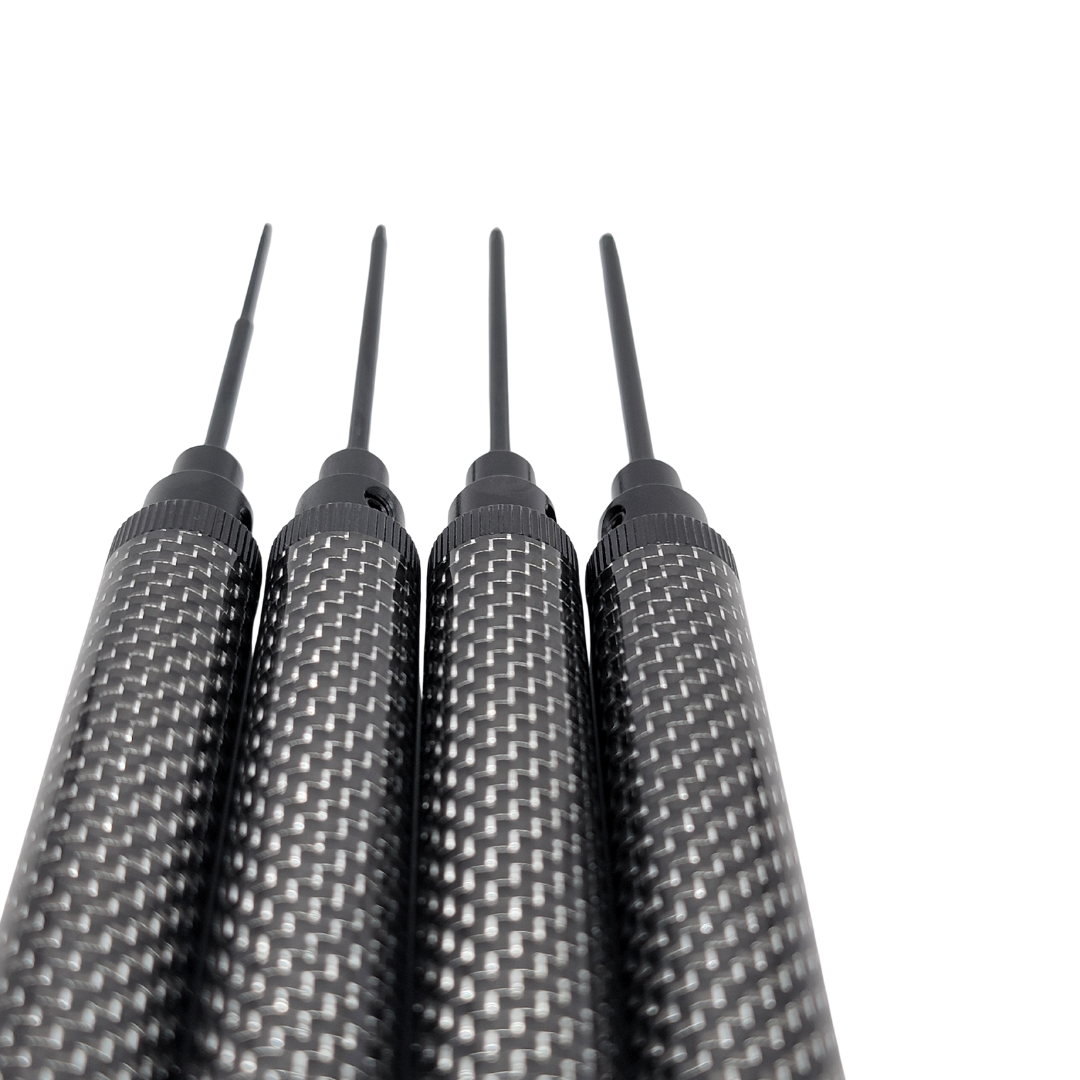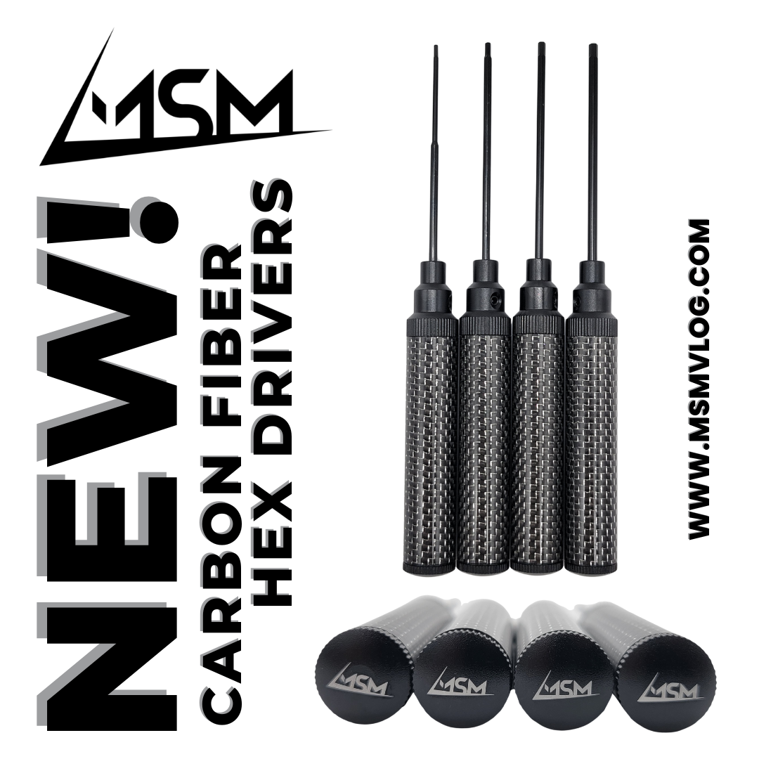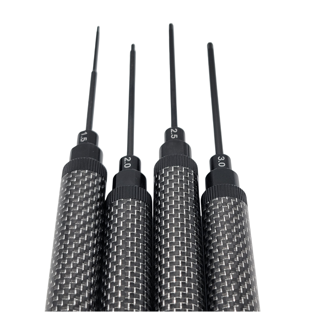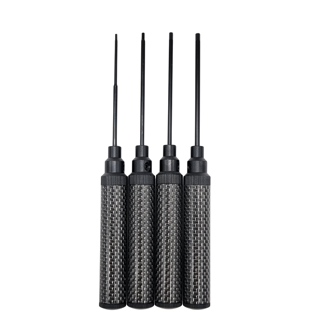 The MSM Carbon Fiber Hex Driver Set in the traditional black colorway includes 1.5mm, 2.0mm, 2.5mm, and 3.0mm hex drivers. Each tip is crafted from high-quality German steel for strength and long-lasting performance. The smooth carbon fiber handle acts like a natural torque limiter, helping you avoid over-tightening screws. Need extra grip? The knurled aluminum sections give you secure control, even when your hands are dusty or oily.