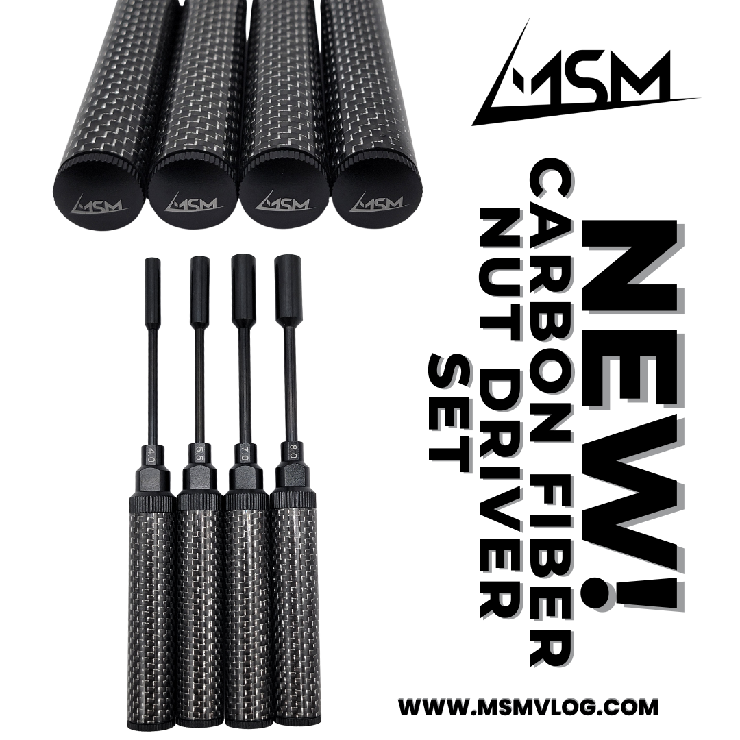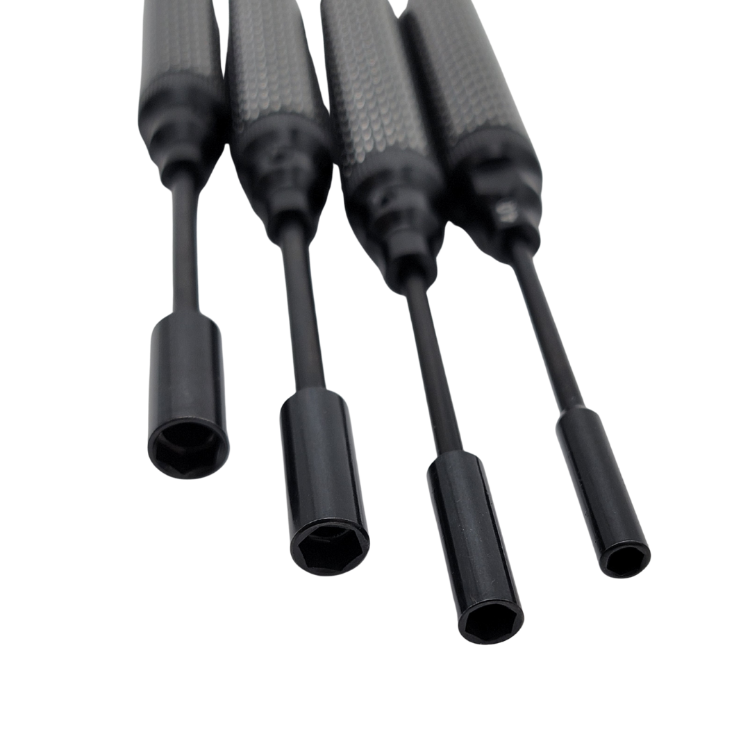 The MSM Carbon Fiber Nut Driver Set in the traditional black colorway includes 4mm, 5.5mm, 7mm, and 8mm nut drivers. Each tip is crafted from high-quality German steel for strength and long-lasting performance. The smooth carbon fiber handle acts like a natural torque limiter, helping you avoid over-tightening screws. Need extra grip? The knurled aluminum sections give you secure control, even when your hands are dusty or oily.