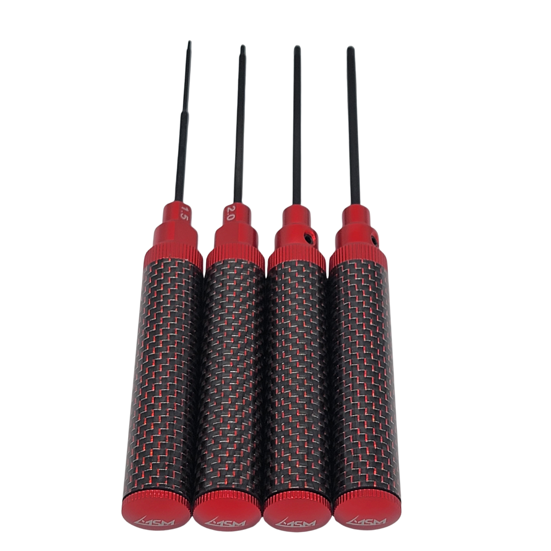 The MSM Carbon Fiber Hex Driver Set in the RED includes 1.5mm, 2.0mm, 2.5mm, and 3.0mm hex drivers. Each tip is crafted from high-quality German steel for strength and long-lasting performance. The smooth carbon fiber handle acts like a natural torque limiter, helping you avoid over-tightening screws. Need extra grip? The knurled aluminum sections give you secure control, even when your hands are dusty or oily.